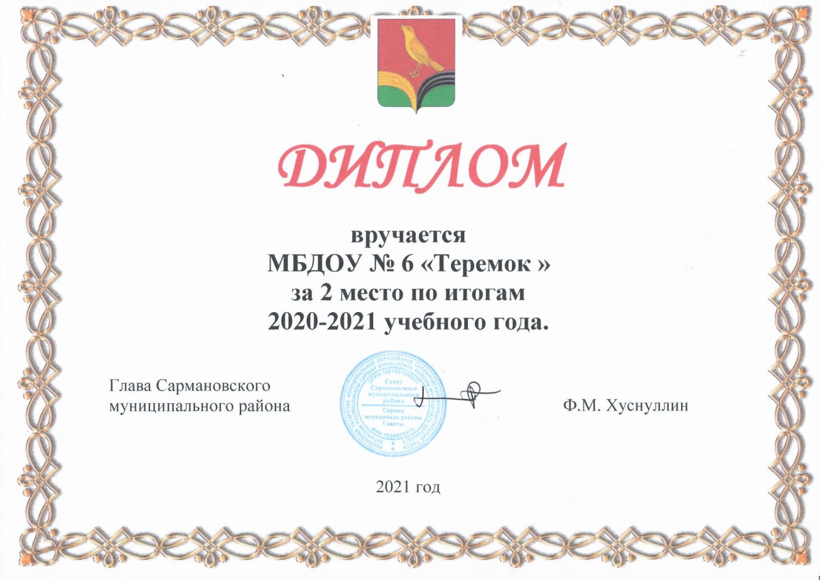 Диплом за 2 место по итогам 2020-2021 учебного года, 2021