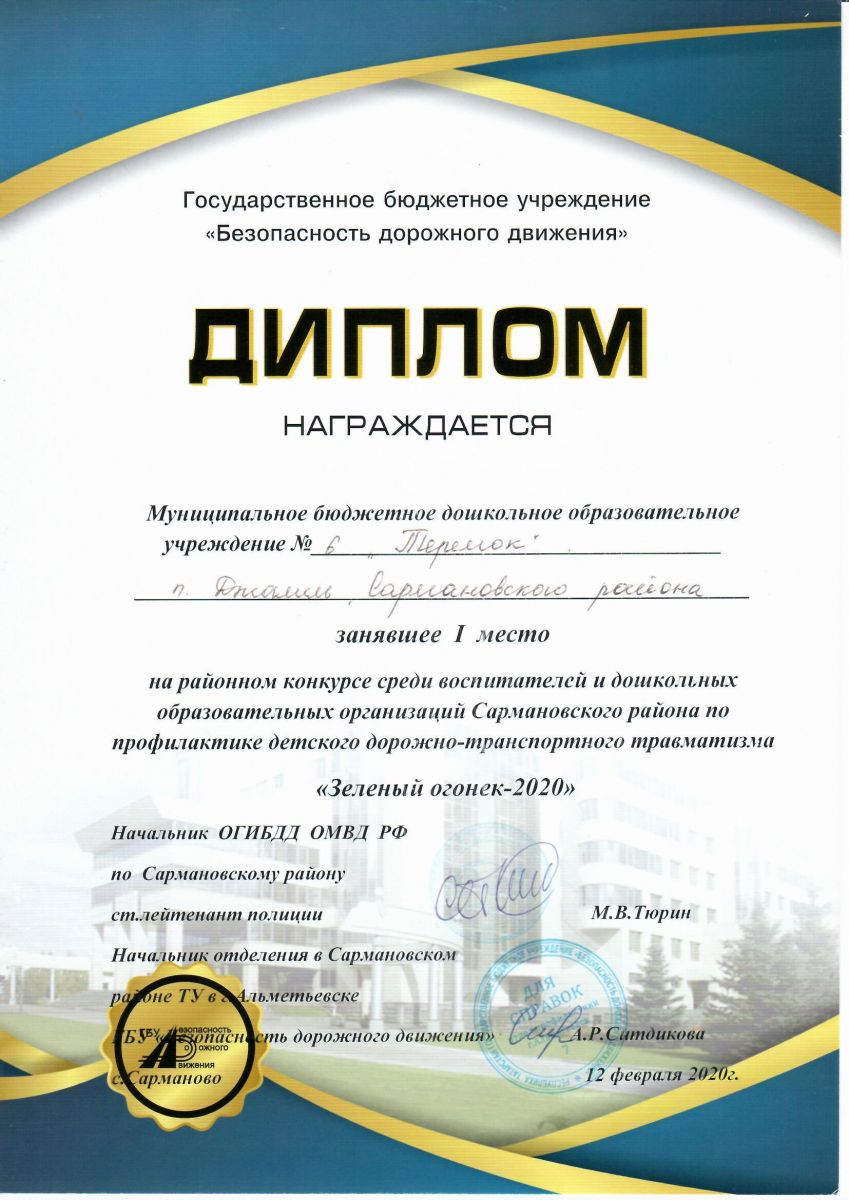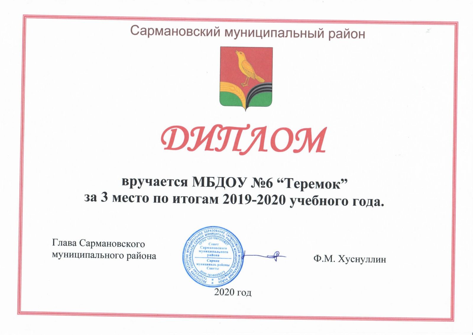 Диплом за 3 место по итогам 2019-2020 учебного года,2020