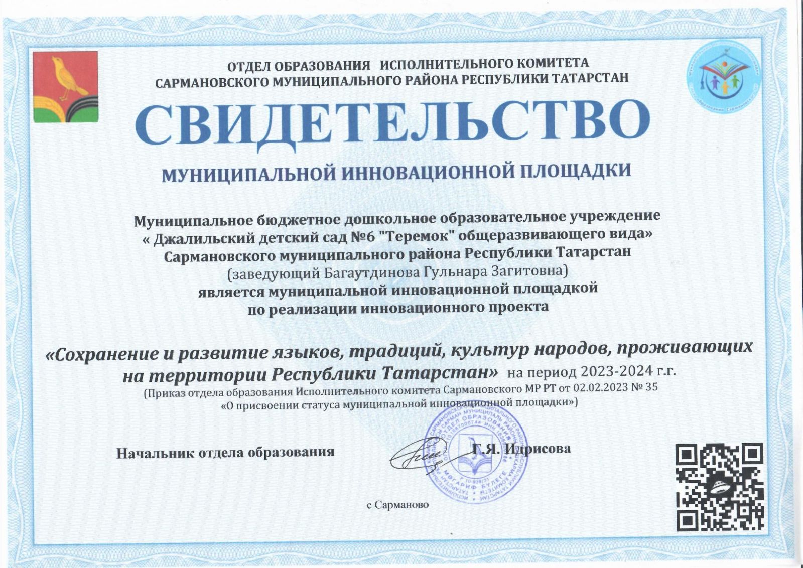 Свидетельство муниципальной инновационной площадки