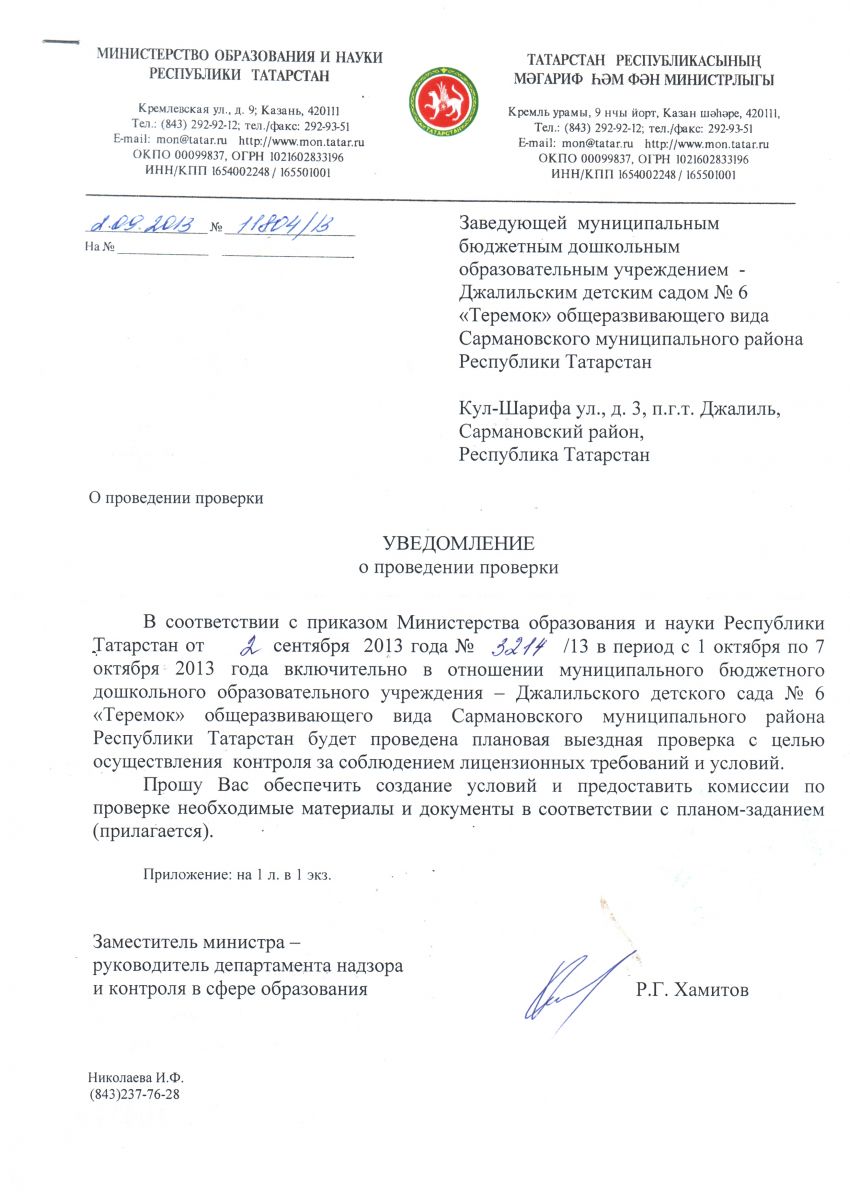 Уведомление о проведение проверки