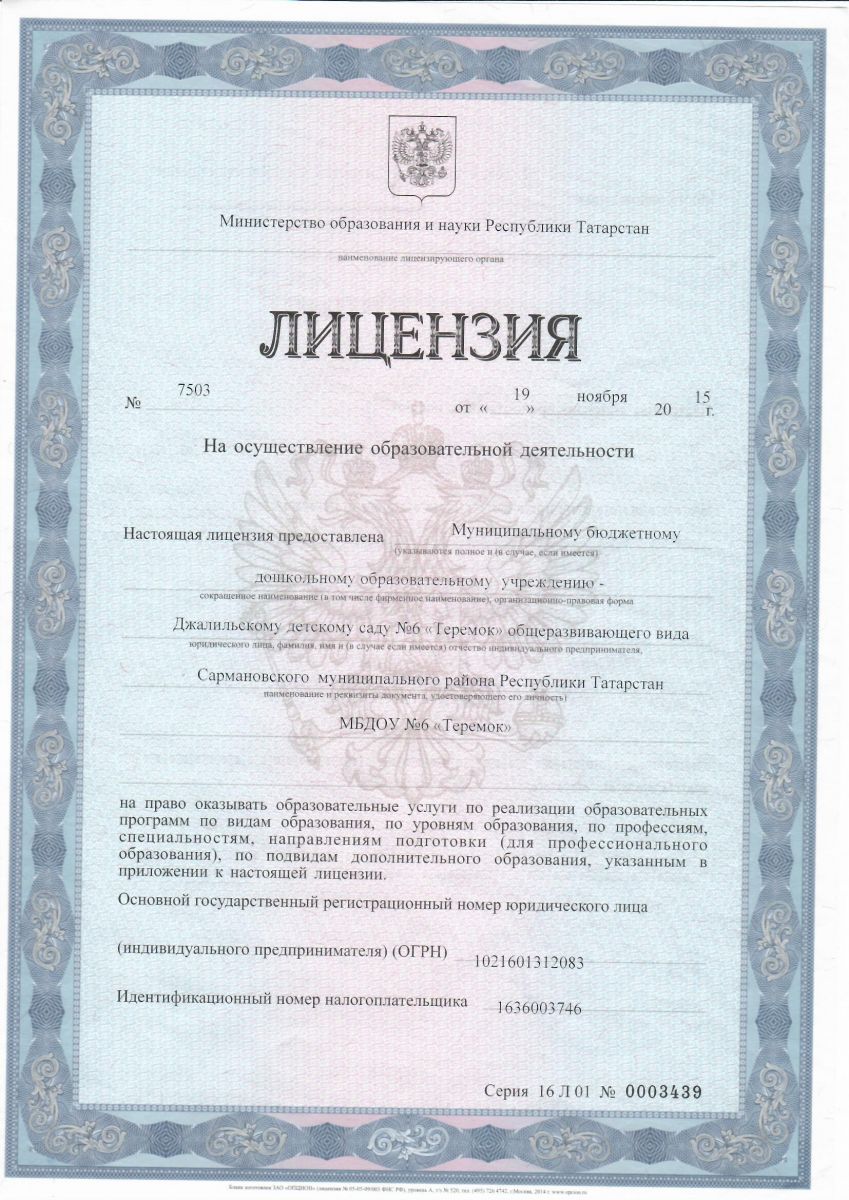 Муниципальное бюджетное дошкольное образовательное учреждение-Джалильский детский сад №6 "Теремок" общеразвивающего вида Сармановского муниципального района Республики Татарстан/Сарман муниципаль районы муниципаль бюджет мәктәпкәчә белем бирү учреждениесе - Җэлил бистәсенең гомуми үсеш төрендәге 6-нчы "Теремкәй" балалар бакчасы