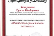 Ученица 6 класса Халиуллина Гузель награждена сертификатом. Республиканский творческий конкурс «Финансовая грамотность населения»