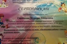 Сертификат регионального семинар-практикума в МБДОУ "Дюймовочка" г. Заинска./Зәй шәhәре "Уймак кыз" балалар бакчасында уздырылган семинар-практикумның сертификаты. 30.10.2018
