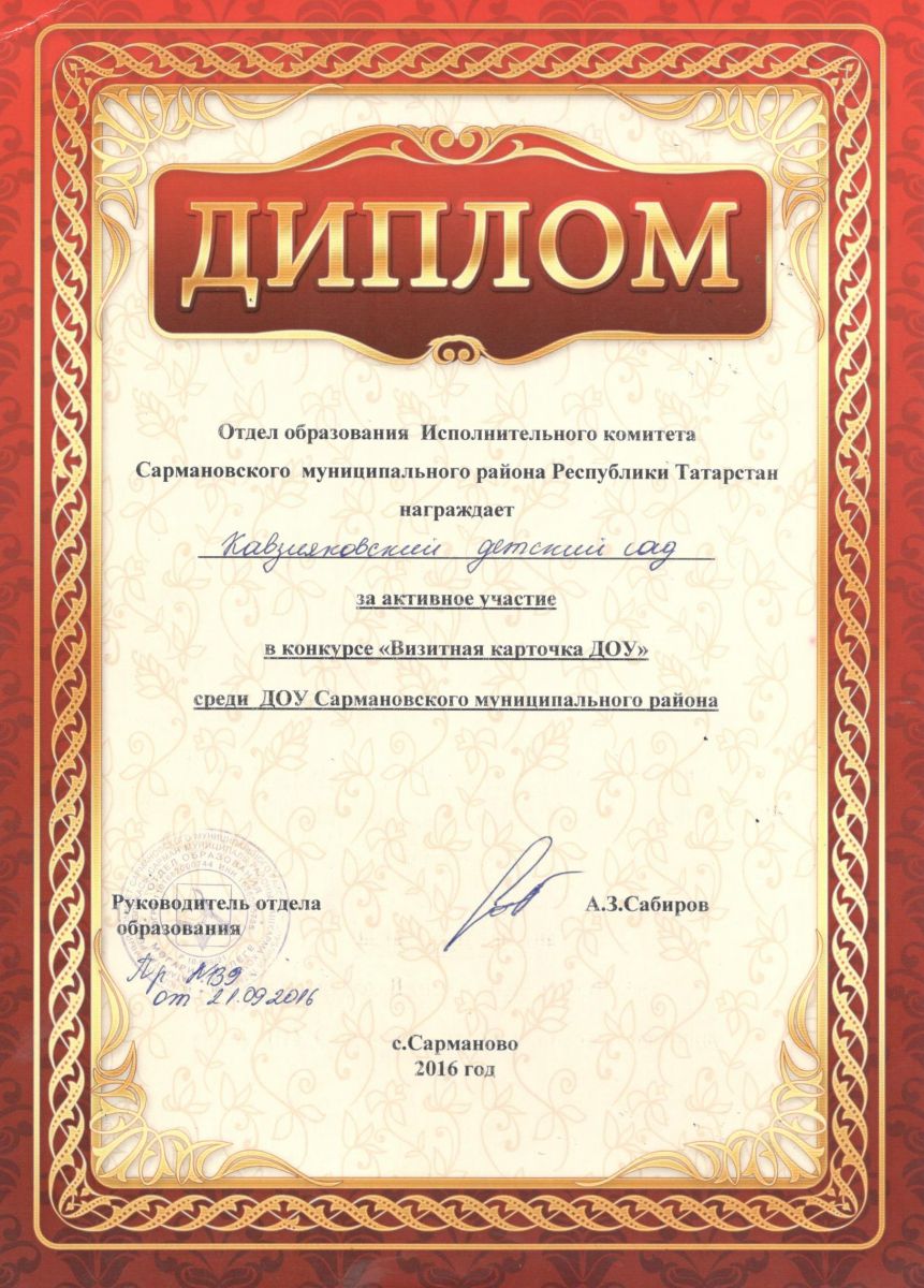 Диплом за активное участие в конкурсе Визитная карточка ДОУ.