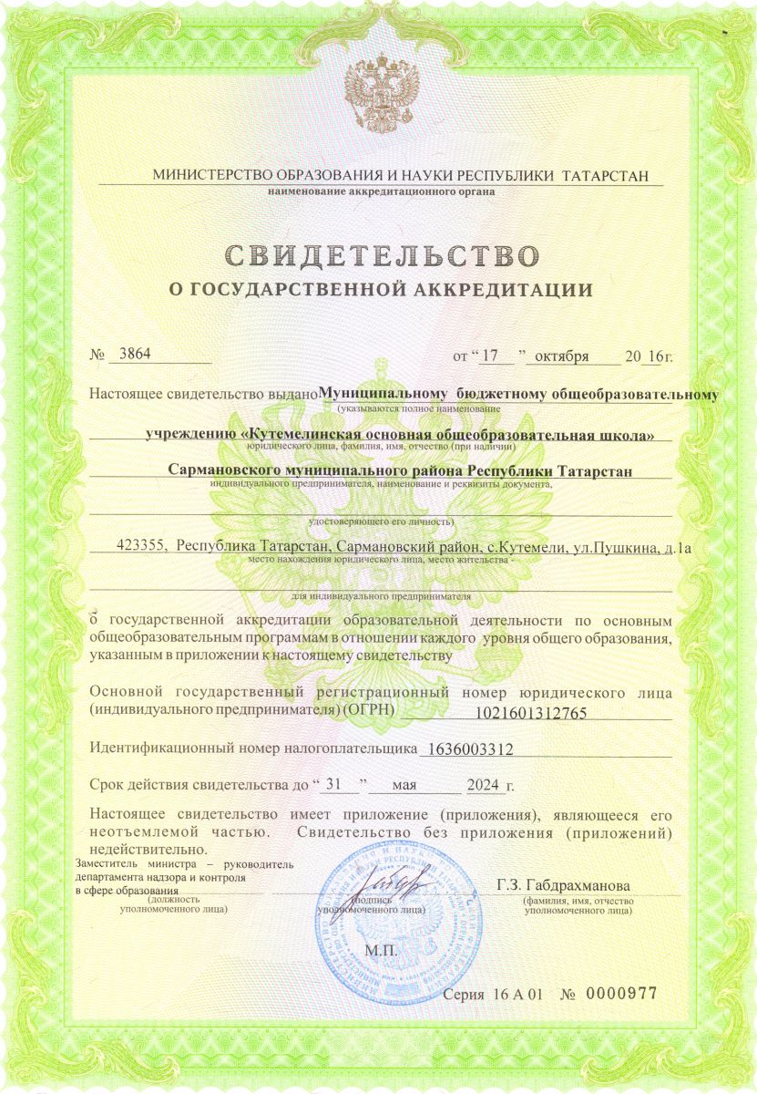 Муниципальное бюджетное общеобразовательное учреждение «Кутемелинская основная общеобразовательная школа» Сармановского муниципального района Республики Татарстан