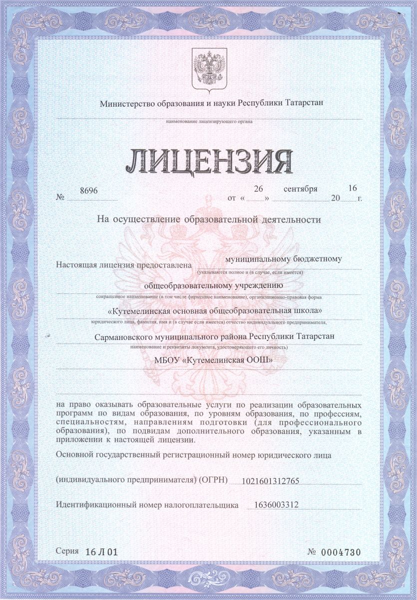Муниципальное бюджетное общеобразовательное учреждение «Кутемелинская основная общеобразовательная школа» Сармановского муниципального района Республики Татарстан