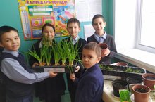 Ученики 1 и 3 классов высадили лук на зелень, укроп, салат. Они каждый день ухаживают за ними: поливают, рыхлят почву. Ведут дневник наблюдений./1 һәм 3 сыйныф укучылары яшел суган, укроп, салат утырттылар. Алар көн саен аларны карыйлар: су сибәләр, туфракны йомшарталар. Күзәтү көндәлеге алып барыла.