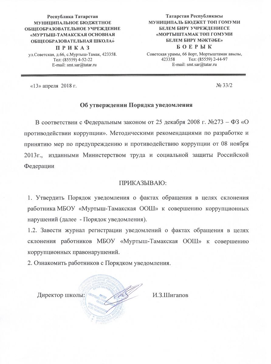 Приказ "Об утверждении порядка уведомления"