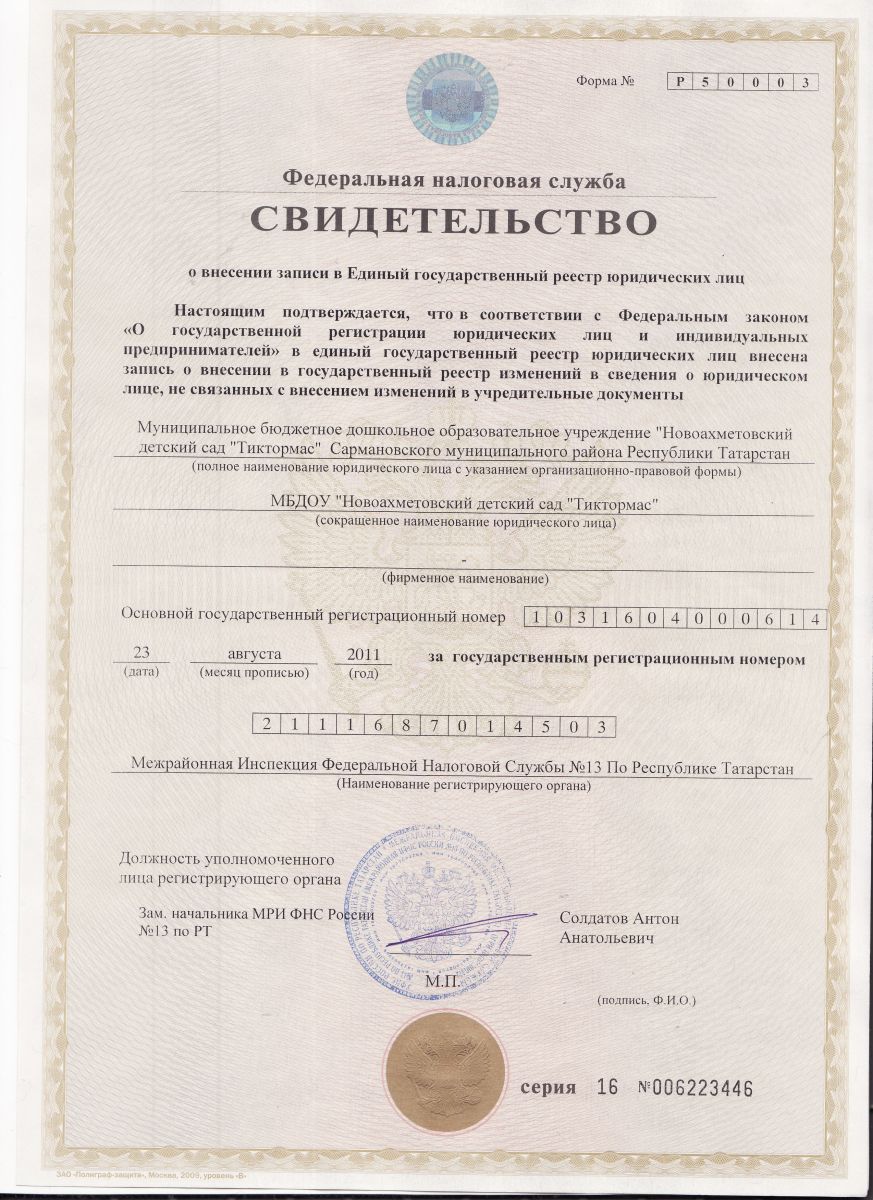 Короткое название: МБДОУ «Новоахметовский детский сад "Тиктормас" Сармановского муниципального района РТ