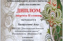 Поздравляем участницу Регионального конкурса детского творчества "Наша сила в единстве" Халиуллину Алсу с заслуженным Дипломом лауреата II степени, преподавателя Миназовой Гульнары Мухтаровны