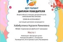 Во Всероссийском конкурсе авторской куклы "КУКОЛЬНАЯ МАСТЕРСКАЯ" Хабибуллина Нурзиля Рамилевна учащаяся МБУДО "Сармановская детская школа искусств им.И.Г.Шакирова" награждена дипломом победителя I место. Руководитель Агелтдинова Гузель Мусавировна.