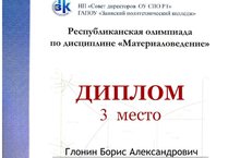Студент 2 группы ГАПОУ «Сармановский аграрный колледж» Глонин Борис Александрович занял 3 место в Республиканской олимпиаде по дисциплине «Материаловедение» и награжден Дипломом III степени. Олимпиада проведена НП «Совет директоров ОУ СПО РТ» и ГАПОУ «Заинский политехнический колледж».