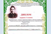 Воспитатели Камалетдинова Г.Г., Гайфуллина Р.А. награждены дипломом 1 степени в республиканском конкурсе творчества авторских лэпбуков и видеориоликов "Тукай яши безнең күңелләрдә", посвященный великому татарскому поэту Г.Тукаю 05.05.2021