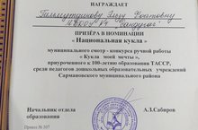 Воспитатель Гильмутдинова Э.Ф. стала призером в номинации "Национальная кукла" в муниципальном конкурсе "Кукла моей мечты"/Тәрбияче Гильмутдинова Э.Ф. "Минем хыялымдагы курчак" муниципаль конкурсының "Милли курчак" номинациясендә җиңүче булды.Котлыйбыз!