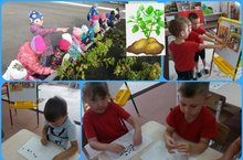 Уртанчы төркем балалары прогулка вакытында яшелчә бакчасында бәрәңгене күзәткәннән соң, әвәләү шөгылендә пластилиннан бәрәңге ясадылар/ Дети средней группы наблюдали за картофелем во время прогулки, затем на занятии по лепке сделали картошку из пластилина 05.09.2019