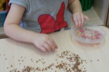 Крупа - очень полезный и приятный материал для занятий с ребенком, кроме того они способствуют развитию мелкой моторики.Воспитатели первой младшей группы часто используют этот интересный материал во время своих занятии.