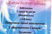 Сабирзянова Самира X район күләм "Җырлы балачак илендә" дип аталган бәйгесендә 1 урын яулады.