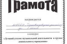 Грамота "Лучший уголок музыкальной деятельности в группе дошкольного учреждения" 10.12.2018