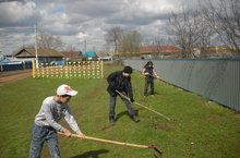 Укучыларыбыз бүген өмәгә чыктылар. Яз көне бакчада эш күп. Укучылар яшелчәләр утырттылар. Укытучыларыбыз да тик тормадылар: стадион яны территориясен чистарттылар, тәртипкә китерделәр. Балалар "Җиңү көне"нә дип чәчәклекне әзерләделәр, үзләре үстергән матур чәчәк үсентеләрен утырттылар. Мәктәбебез тагы да ямьләнеп китте.