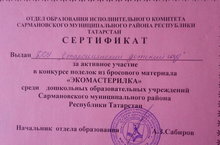 Выдан сертификат за участие в конкурсе "Экомастерилка"./"Экомастерилка" бәйгесендә сертификат бирелде.