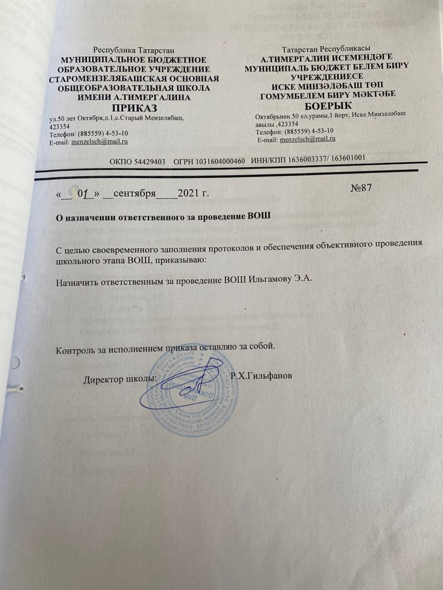 Ответственный за организацию, проведение и проверку олимпиадных работ - заместитель директора по учебной работе Ильгамова Э.А. (приказ о назначении)