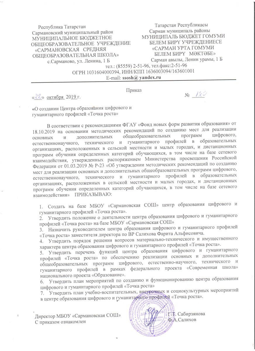 Приказ о создании Центра образования цифрового и гуманитарного профилей "Точка роста"