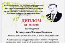 Воспитательница Гатиятуллина Эльмира Наиловна награждена Дипломом III cтепени в номинации "Лучший исполнитель стихов среди педагогов" Республиканского конкурса чтецов стихов Роберта Миннуллина на татарском языке среди детей дошкольного возраста,родителей, и педагогов дошкольных образовательных учреждений "Күчтәнәч"