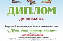 Безнең бакчабызда тәрбияләнүче Хабибуллин Данир "Мин бит татар малае" конкурсында Дипломант дәрәҗәсен алды. Аңа алга таба да зур уңышларга ирешүен телибез. /Участвовали в Всероссийском конкурсе детского творчества "Мин бит татар малае".