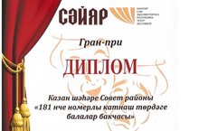 Поздравляем весь коллектив и наших воспитанников с победой в конкурсе Сэйяр. Педагоги совместно с детьми долго трудились над постановкой авторской сказки, написанной воспитателем по обучению татарского языка - Шамсутдиновой Алсу Миннеахметовны. Мы гордимся нашими детьми и нашими педагогами.