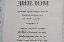Воспитанники МАДОУ "Детский сад №402" награждены Дипломом лауреата городского фестиваля детского творчества "Балачак иле"