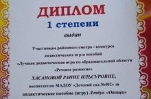 Хасанова Рания Ильсуровна, воспитатель МАДОУ "Детский сад №402", награждена ДИПЛОМОМ 1 степени районного смотра-конкурса дидактических игр и пособий "Лучшая дидактическая игра по образовательной области "Речевое развитие" за дидактическое пособие (игру) Лэпбук "Овощи"...