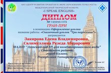 Педагоги нашего детского сада Закирова Елена Владимировна, Салимуллина Резеда Абузаровна принимали участие в Международном творческом конкурсе "I SPEAK ENGLISH" и награждены Дипломом ГРАН-ПРИ. Поздравляем и желаем дальнейших творческих успехов