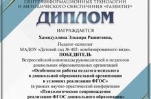 Педагог-психолог нашего детского сада,Хамидуллина Эльвира Рашитовна принимала участие во Всероссийской олимпиады руководителей и педагогов дошкольных образовательных организаций "Особенности работы педагога -психолога в дошкольной образовательной организации в условиях реализации ФГОС". Была награждена Дипломом Победителя. Поздравляем, и желаем дальнейших творческих успехов!