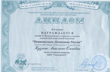 Дипломом II степени награждается призер VI Всероссийского открытого конкурса достижений талантливой молодежи "Национальное Достояние России" ученица 10 б класса Кузина Ангелина.