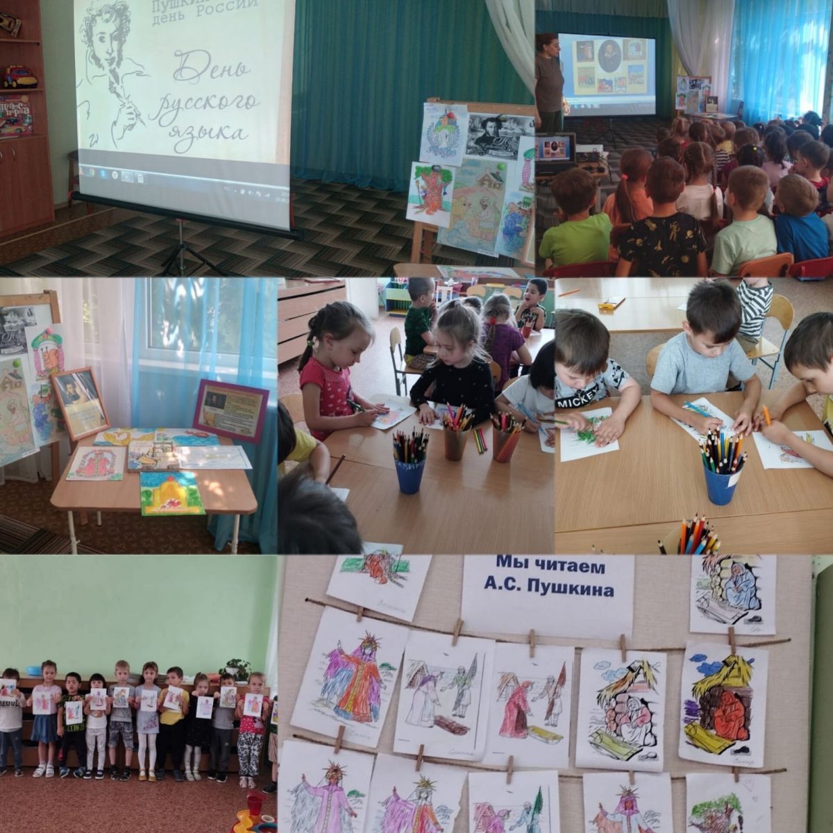 День А.С.Пушкина начался с выставки книг великого поэта, затем посмотрели иллюстрации из любимых сказок, а так же вспомнили строчки из известных произведений поэта. В конце устроили выставку детских работ "По страницам сказок Пушкина".