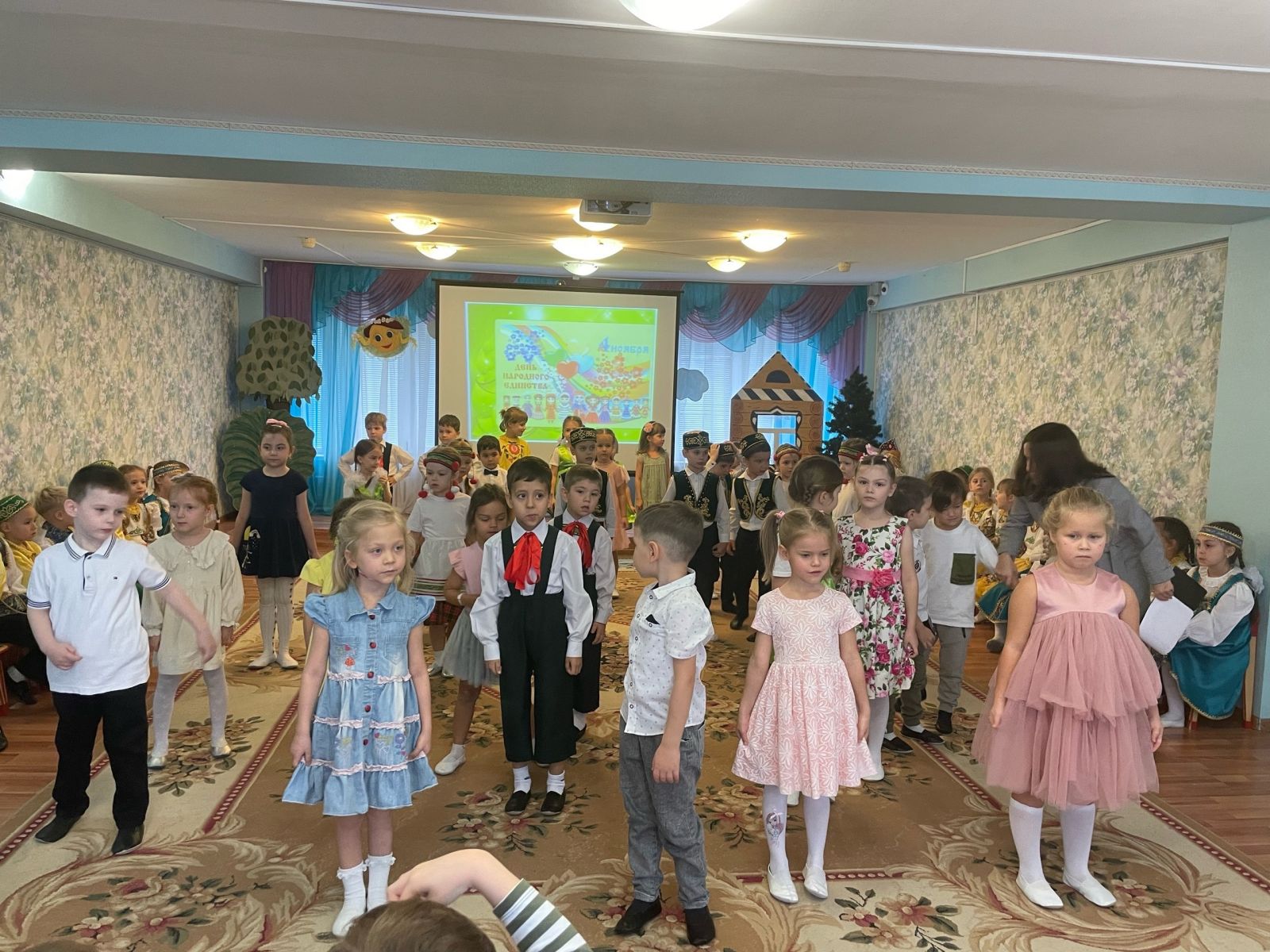 В преддверии праздника «Дня народного единства» в Доу было проведено мероприятие с целью знакомства детей с праздником – «День народного единства», расширения представления детей о родном крае, стране, в которой мы живем, развития любознательности, привития любви к Родине, воспитания патриотических чувств, доброжелательного отношения друг к другу, желания прийти на помощь. Закрепили знания об основных символах нашей страны, читали стихи, пели песни о Родине, танцевали, и играли в народные игры.