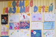 Ко Дню космонавтики в детском саду оформлена выставка рисунков "Космос глазами детей".