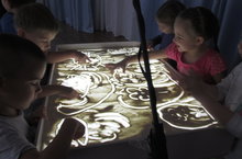 В начале представления художник Юлия Титова представила детям волшебную сказку "Золушка", выполненную из песка на специальном световом столе. Изображения передавались на большой экран (был создан эффект кинотеатра).