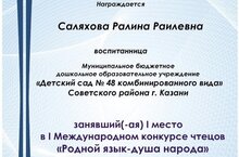Воспитанница подготовительной к школе группы №4 Саляхова Ралина под руководством педагогов Кашаповой Г.Н. и Саляховой А.Г. заняла 1 место в I Международном конкурсе чтецов "Родной язык - душа народа". Поздравляем с успешным участием в конкурсе!