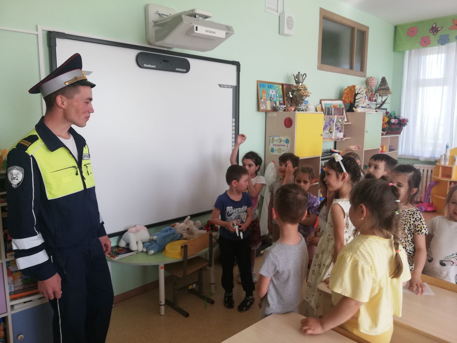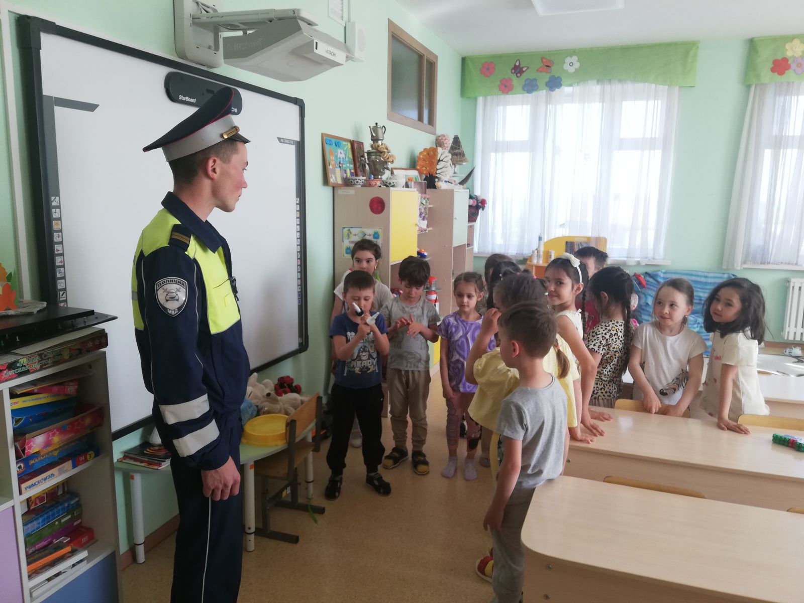 В нашем детском саду, вопросу безопасности детей на улицах и дорогах уделяется большое внимание. 19 мая в гостях у воспитанников старшей группы №6 и второй младшей группе №1 инспектор ГИБДД. Целью этой встречи было закрепление знаний о правилах дорожного движения, профилактика детского дорожно-транспортного травматизма.