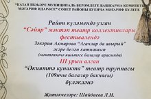 Воспитанники театральной студии ДОУ "Экияттэ кунакта" с удовольсттвием принимают участие в разнообразных конкурсах. Руководитель студии - воспитатель по обучению татарскому языку Шайдаева Л.Н. представила видео-материалы в жюри театрального конкурса-фестиваля "Саяр" в результате - III место. Поздравляем!!!