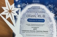 21.01.2018 года в Доме Дружбы народов Татарстана прошел III Международный фестиваль-конкурс "Путь к Вифлеемской звезде". Участники фестиваля, воспитанницы МАДОУ Смирнова А. и Саматова З., проявили свое мастерство в вокальном дуэте и стали лауреатами III степени в номинации "Эстрадный вокальный ансамбль" в первой возрастной категории до 6 лет. Музыкальный руководитель Мишура Р.Р. Поздравляем!
