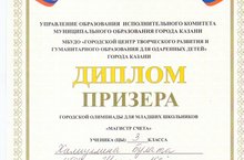 пОЗДРАВЛЯЕМ УЧЕНИКА 3 КЛАССА ХАЛИУЛЛИНА БУЛАТА С ПОБЕДОЙ В ГОРОДСКОЙ ОЛИМПИАДЕ ДЛЯ МЛАДШИХ ШКОЛЬНИКОВ "МАГИСТР СЧЕТА". ПОДГОТОВИЛА ПРИЗЕРА САЛЬНИКОВА А.Р.