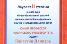ПОЗДРАВЛЯЕМ УЧЕНИКА 4 КЛАССА БАЙГУЗИНА ДАНИЭЛЯ С ПОБЕДОЙ В РЕСПУБЛИКАНСКОЙ ДЕТСКОЙ МЕЖПРЕДМЕТНОЙ КОНФЕРЕНЦИИ "ЮНЫЙ ПРОФЕССОР КАЗАНСКОГО УНИВЕРСИТЕТА". ПОДГОТОВИЛА ПРИЗЕРА УЧИТЕЛЬ НАЧАЛЬНЫХ КЛАССОВ ВОРОПАЕВА Н.Н.