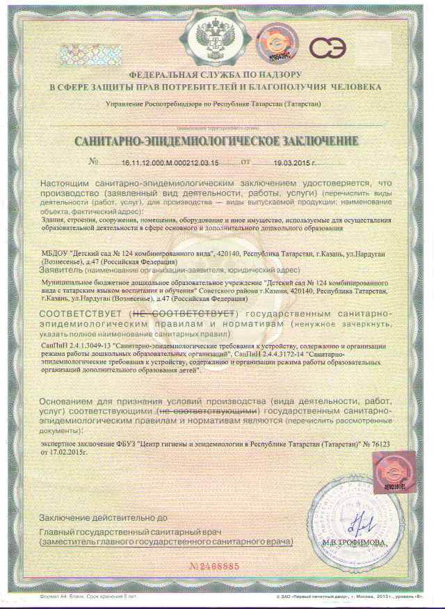 Санитарно-эпидемиологическое заключение от 19.03.2015