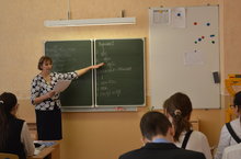 11 сыйныф укучылары математика фәненнән консультациядә. Алар укытучылары Кульмамедова Р.Р. белән бердәм дәүләт имтиханы биремнәрен үтиләр, катлаулы мәсьәләләр чишәләр.