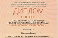 "Үз тамырларыңны истә тотып яшәргә..." дип исемләнгән XI Республика конференциясенең нәтиҗәләре билгеле булды. Безнең укучыбыз Шакирова Самирә "Видеоэкскурсия" номинациясендә 1 нче урынга лаек булды. Самирәне һәм аның җитәкчесе Шәңгәрәева М.В.ны җиңү белән котлыйбыз һәм киләчәктә дә уңышлар телибез!