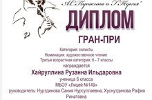 Чираттагы җиңү! 6 нчы Г сыйныфы укучысы Хәйруллина Рузанна “Пушкин һәм Тукай йолдызлыгында” республика әдәби бәйгесендә катнашып, “Сәнгатьле уку” номинациясендә Гран-прига ия булды. 7 нче А сыйныфы укучысы Хәбибрахманов Җәмил дә 1 нче дәрәҗә лауреат исеменә лаек дип табылды. Бәйгегә әзерләгән укытучылар Нуртдинова Сания Нурсуллаевнаны һәм Миргалиева Диләрә Рафатовнаны укучыларының уңышы белән котлыйбыз!