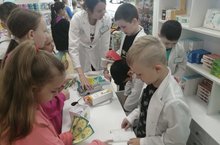 Сегодня ребята из пришкольного лагеря были на экскурсии в аптеке "Планета здоровья". Детям предложили ролевую игру в которой они были в роли юного фармацевта и покупателя. Юным фармацевтам нужно было прочитать рецепт, найти нужное лекарство на полках и выдать чек. В конце мероприятия дети получили от аптеки призы.