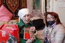 В преддверии празднования 75-й годовщины Великой Победы от имени руководства республики и города поздравляли работников тыла и ветеранов юбилейной медалью и подарком. На фото Гадельшина Биби-Сара Шагиахметова.